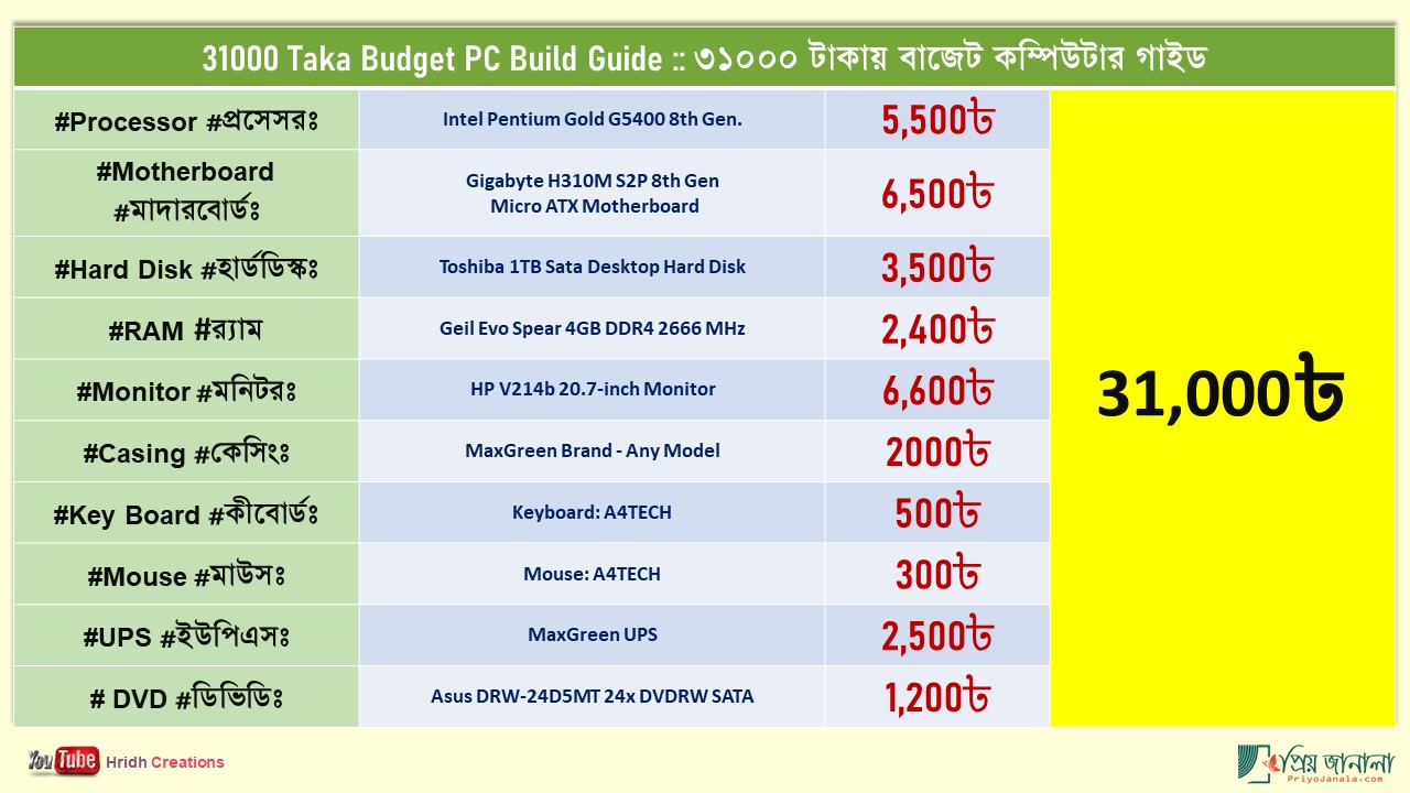 বিশেষ কথাঃ কম্পিউটার কেনার পুর্বে অভিজ্ঞদের পরামর্শ নিন, কেনার পুর্বে প্রথমে দুই একদিন মার্কেটে গিয়ে কিছু ভাল দোকান থেকে কনফিগার সহ বিল্ড করে নিয়ে আসুন ও তা যাচাই বাচাই করে ঠান্ডা মাথায় সিদ্ধান্ত নিন। আমি আমার অভিজ্ঞতার সাপেক্ষে ভিডিও টি বানিয়েছি তবুও ভুল ত্রুটি হতে পারে আশা করি ক্ষমার চোখে দেখবেন। কোন প্রশ্ন থাকলে কমেন্ট করবেন।